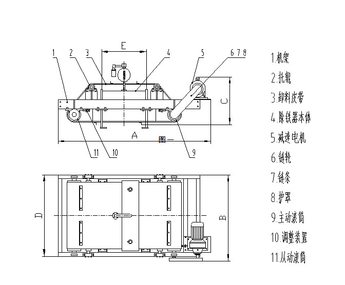 RCDF系列油冷自卸式电磁除铁器由除铁器本体和卸铁机构两部分组成。卸铁机构由机架、摆线针轮减速机(以下简称减速电机)、主 从动滚筒、托辊、皮带轮(或链轮)、三角带(或皮带轮)和装有刮板的卸铁皮带组成。