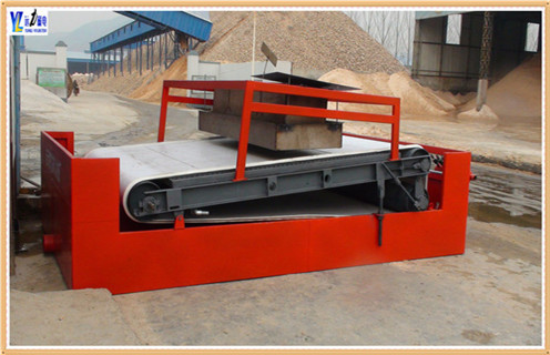 2、矿粒经输送皮带被送进上磁辊选别,因为褐铁矿的矿粒有带磁,马上被强磁场吸咐在磁辊上,而脉石粒(杂石、碎石土)因为沒有带磁(带磁太弱),磁辊的强磁铁对它不造成吸附力,伴随着磁辊的旋转,矿粒一直被吸在磁辊上,而脉石粒在磁辊转到前端开发部位时被抛出去掉在隔矿板的前边(根据更改隔矿板视角的尺寸可调节精矿的品味),矿粒再次被磁辊送到脱磁区时全自动跌入一选集矿斗搜集为精矿制成品。
